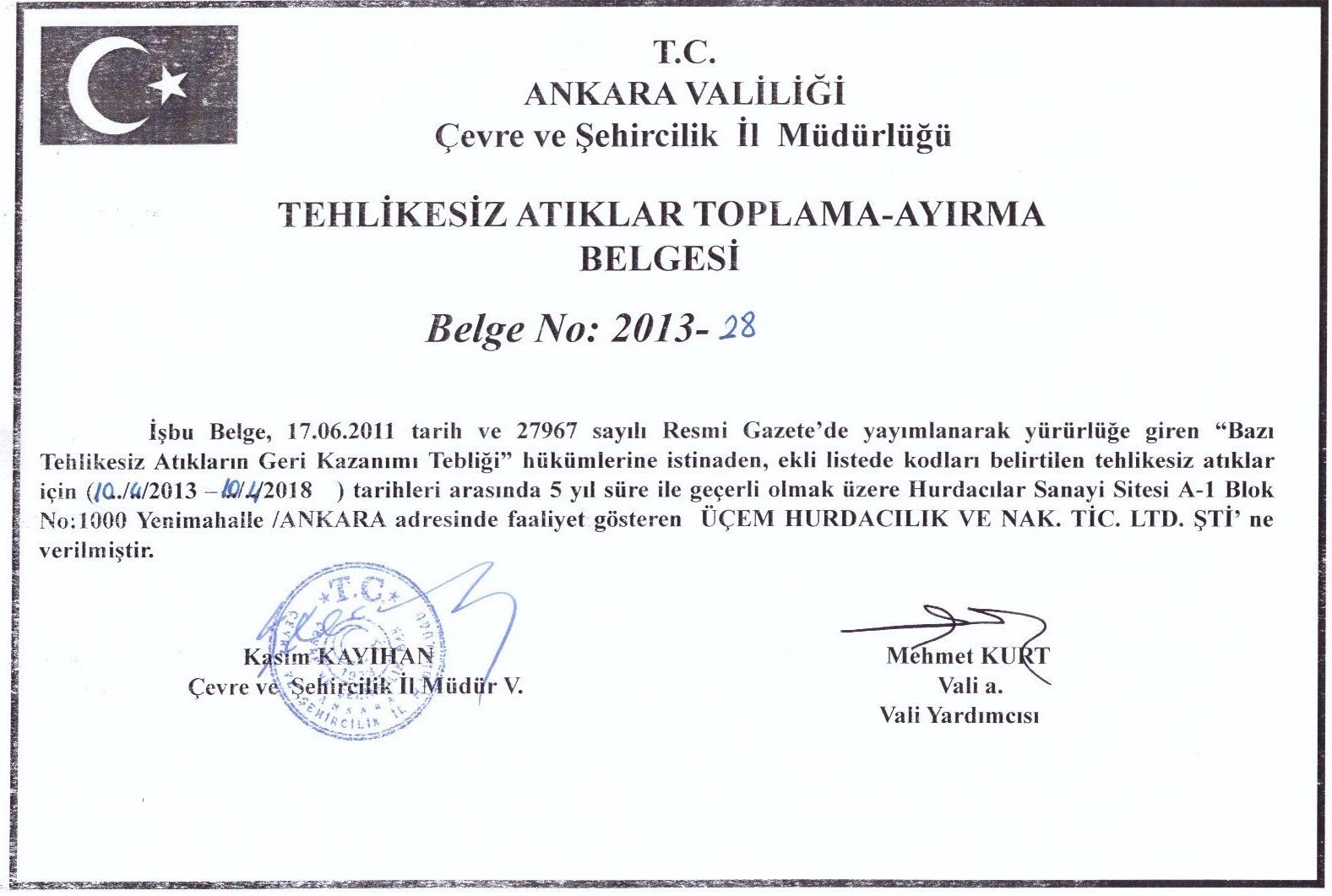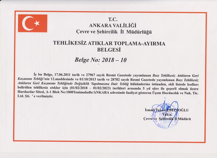 Firmamız tüm geridönüşüm proseslerini, yükleme, boşaltma, tasnif etme, presleme, stoklama sevk etme vb. işlemleri kendi bünyesinde yetişmiş deneyimli çalışanları tarafından lisanslı tesisinde yapmaktadır. T.C. Çevre Bakanlığı ile koordine çalışan firmamız Bakanlığın ilgili Atık Yönetmeliğine uygun olarak tüm prosesleri gerçekleştirmekte ve Çevre Bilgi Sistemine atık giriş ve çıkışlarını günlük olarak yapmaktadır.